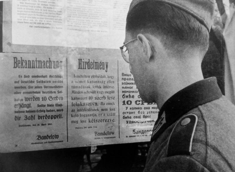 Солдат вермахта читает объявление немецкого коменданта города Панчево (Pancevo) оберстлейтенанта полка «Великая Германия» Ф. Банделова (F. Bandelow), изданное на трех языках: «Вновь были совершены покушения на немецких солдат. За каждого раненого или убитого немецкого солдата БУДУТ ПОВЕШЕНЫ 10 СЕРБОВ. Если эти меры не приведут к успеху, число будет удвоено. Панчево, 21 апреля 1941 г.».