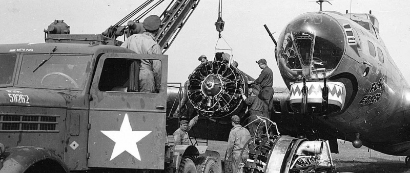 Замена двигателя на американском бомбардировщике В-17 «Летающая крепость» с именем собственным «Flak Eater» (пожиратель зениток) с помощью крана на шасси грузовика Federal C-2. 1944 год.