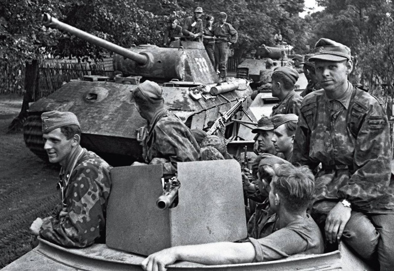 Боевая группа Мюленкамп (Kampfgruppe Mühlenkamp) 5-й танковой дивизии СС «Викинг» (5.SS-Panzer-Division «Wiking») движется по улице деревни в восточной Польше, в ходе попыток сдержать наступление Красной Армии в операции «Багратион». Солдаты перемещаются в бронетранспортере Sd.Kfz. 251. На втором плане танк «Пантера» Pz.Kpfw. V. Ausf. A c тактическим номером 533.