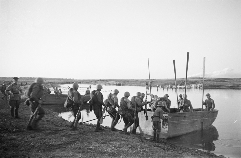 Советские солдаты готовятся переправиться на лодках через реку южнее Воронежа