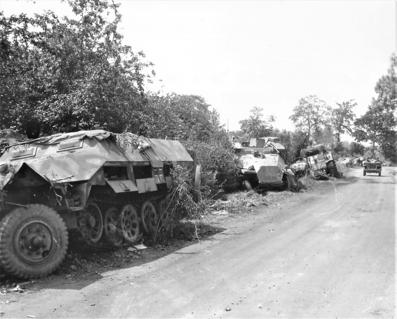 В колонне: бронетранспортер Sd.Kfz.251 Ausf. D, бронетранспортер инженерных подразделений Sd.Kfz.251/7 Ausf. D, остов автомобиля Horch 901 и далее бронетранспортеры Sd.Kfz.251 Ausf. D. В кадре присутствует сгоревший танк Sherman М4 3-й роты 67-го танкового полка (67th Armored Regiment) США. По дороге движется джип Willys MB 2-й танковой дивизии (2nd Armored Division) США. Голова данной колонны запечатлена на следующей фотографии.