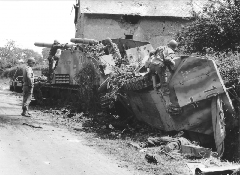 Американцы осматривают подбитые немецкие САУ «Хуммель» (№ 110 Clausewitz) и бронетранспортер Sd.Kfz. 251 из состава танковой дивизии СС «Дас Райх». На переднем плане труп немецкого солдата. Чемодан возле убитого — деревянный ящик для 2-х снарядов к 7.5 cm KwK 42, которая стояла на «Пантерах».
