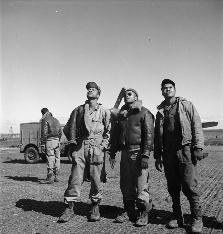 Трое чернокожих американских авиационных техников смотрят на небо на итальянском аэродроме Рамителли. март 1945