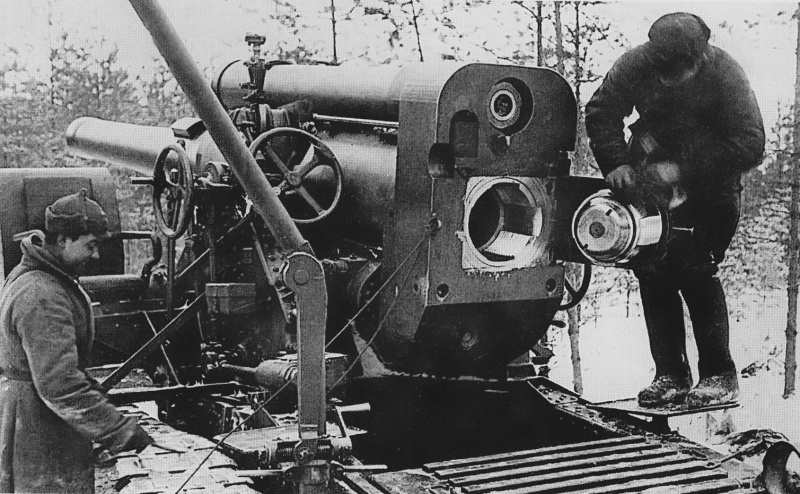 Красноармейцы за чисткой 203-мм гаубицы Б-4 на Карельском перешейке.