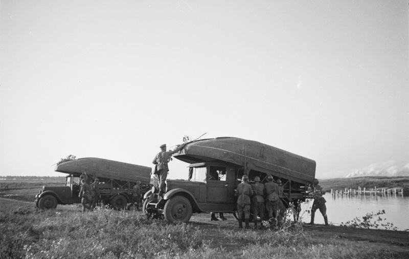 Красноармейцы выгружают лодки с грузовиков для переправы через реку южнее Воронежа.