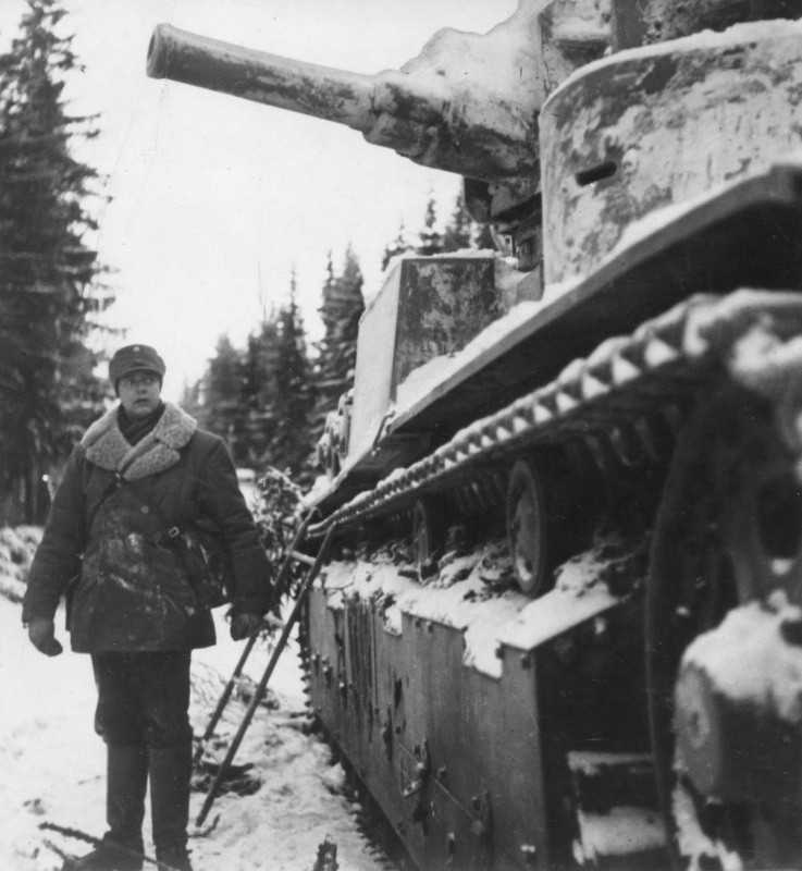 Финский солдат рядом с захваченным советским средним танком Т-28. декабрь 1939 - февраль 1940