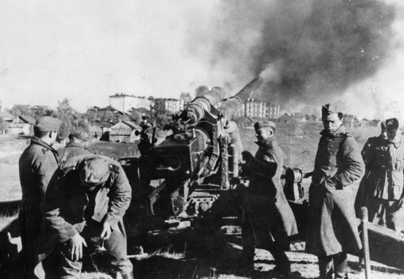 Расчет немецких артиллеристов ведет огонь из 105-мм тяжелого полевого орудия sK 18 (10,5 cm schwere Kanone 18) на окраине Калуги. 21.10.1941