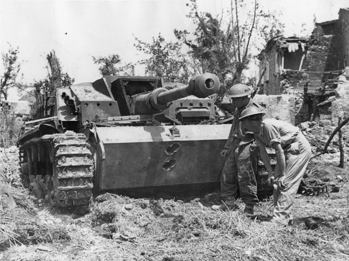 Британские солдаты смотрят на пробоины в лобовой броне немецкой САУ StuG III ausf G. Эта САУ (предположительно из состава 907-й бригады штурмовых орудий — Stg.Brig.907) была подбита двумя 75-мм снарядами танка М4 «Шерман» в районе Кассино (Cassino) на линии Гитлера 18 мая 1944 года.