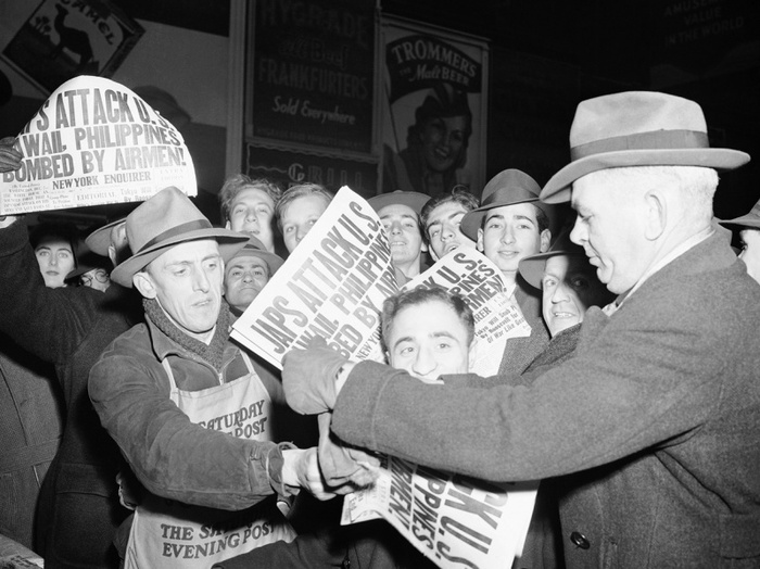 Продажа свежей прессы на Таймс-Cквер в Нью-Йорке с сообщением о японских атаках военных баз США в Тихом океане. 07.12.1941