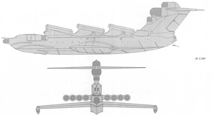 Он оснащался восьмью турбореактивными двигателями НК-87, модификацией авиационного двигателя от стратегического бомбардировщика Ту-160. Шесть двигателей были установлены в носовой части под углом вниз, чтобы усиливать экранный эффект при взлёте. Два дополнительных двигателя в хвостовой части обеспечивали стабильность в полёте.
