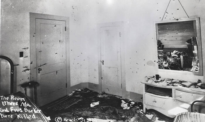 (Из банды Баркера-Карписа: 19 арестованы; 4 убиты правоохранителями; 3 убиты гангстерами). Точное число их жертв неизвестно. Лишь отец кровавых братьев, Джордж Баркер, не имел никакого отношения к делам семейной банды. Зато жив остался и до самой кончины проблем с законом не имел... На фото- кадры из той квартиры, где застрелили Аризону Баркер: