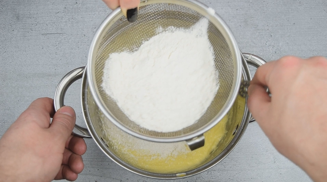 3. Муку и разрыхлитель просеиваем через сито в нашу яичную смесь и перемешиваем