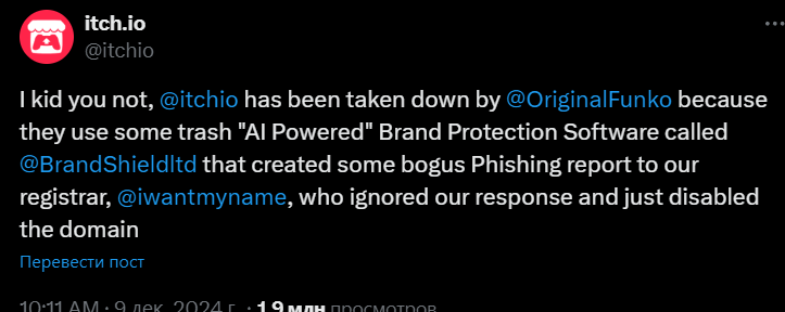 Как стало известно, автоматическая система защиты бренда Funko BrandShield отправила регистратору Itch.io ошибочный отчёт о фишинговой угрозе.