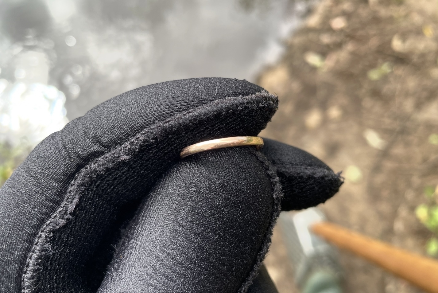 Единственное золотое украшение я нашла у себя в речке-переплюйке на месте старого еще советского пляжа. Тоненькую обручалочку удалось выцепить с новым металлоискателем на том месте, где я уже бродила с Апексом. Размышлениям об этом удивительном факте была посвящена целая статья, кому интересно – ознакомитесь.
