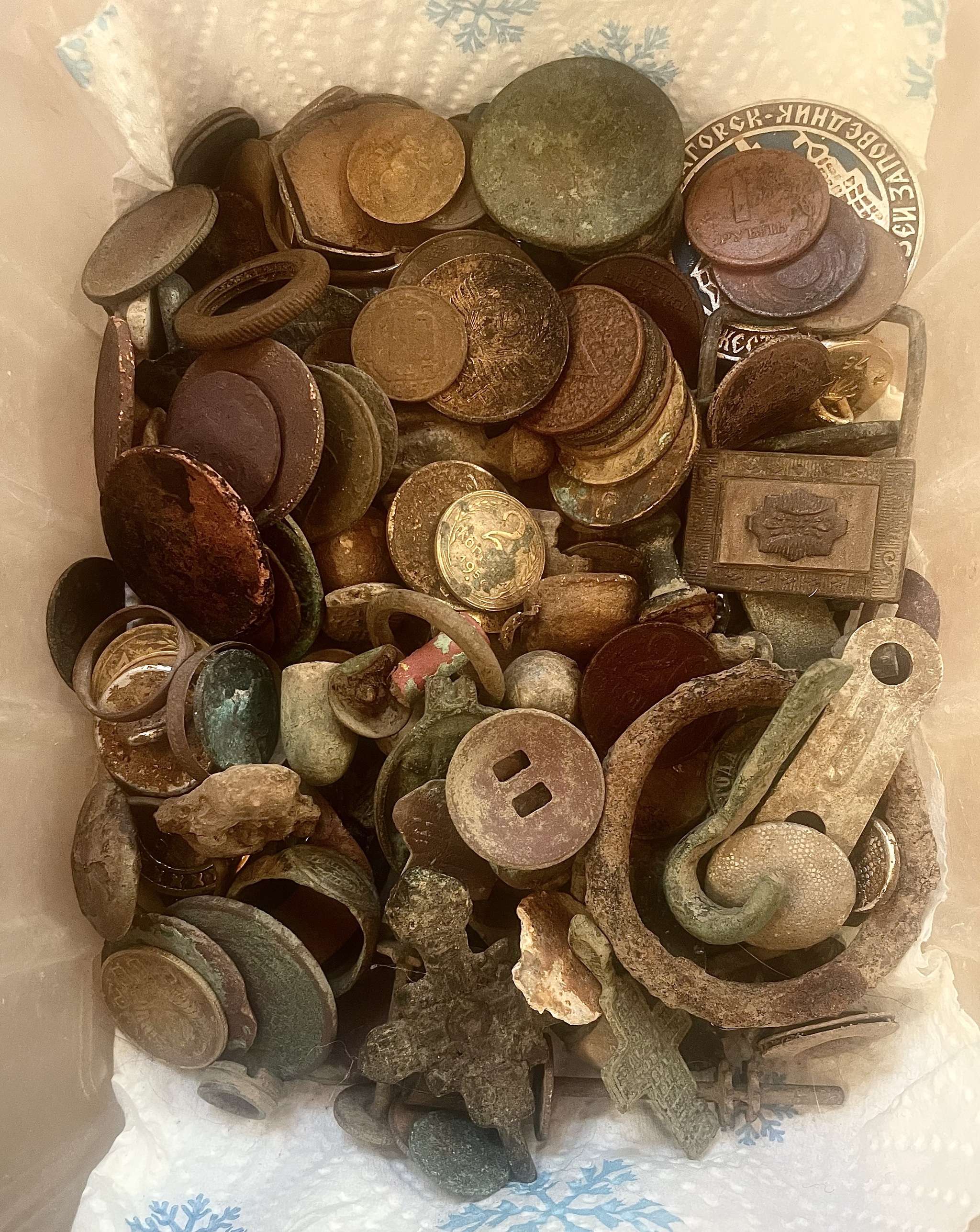 Конины в этом сезоне попалось удивительно мало, обычно больше и больше находила торговых пломб. Порадовали 2 оловянных солдатика, которых до этого ни разу не находила, пара советских часов.