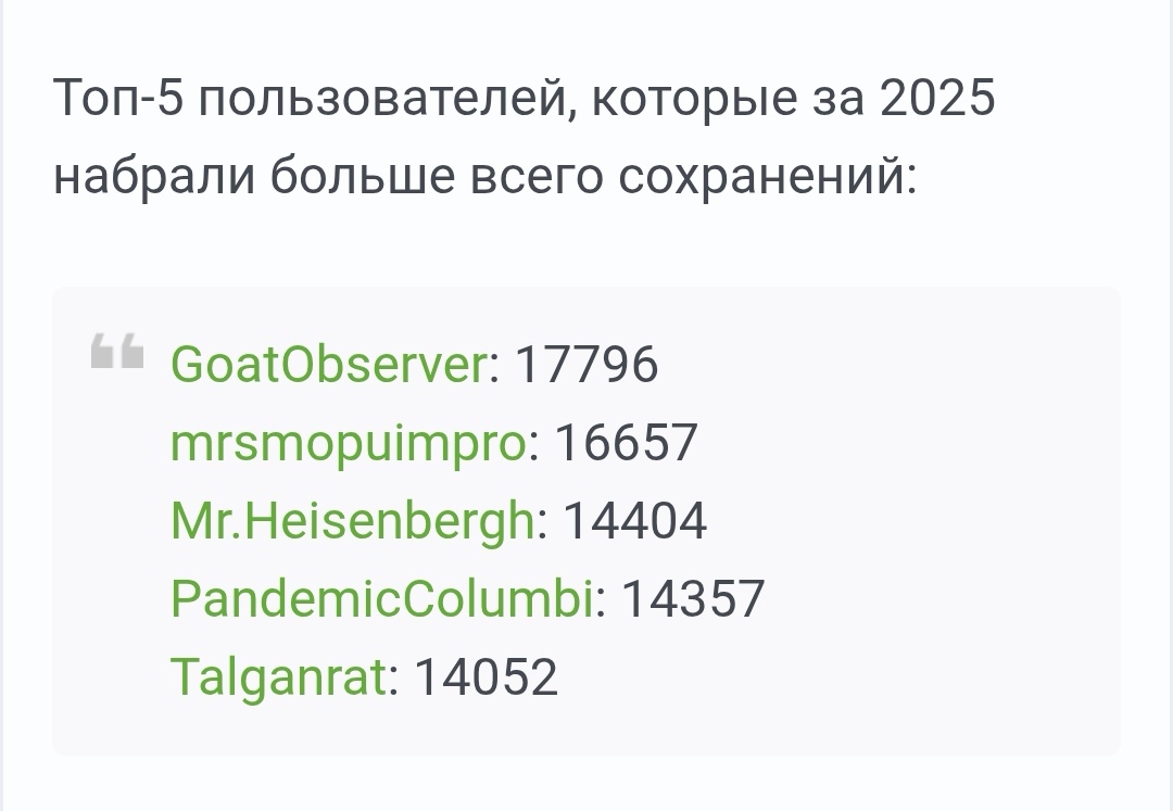 Если вы дочитали досюда, то скорее всего вы узнали много нового, но вряд ли эта информация будет для вас полезна (хотя на сохраненные посты обратите внимание, они хороши). Зато - здесь в одном месте собрано многое из того, чем жил и дышал Пикабу в лице всех его участников в 2025 году. Здесь вы можете найти для себя интересные посты или пару авторов, спрятаться от пары надоевших волн постов или хотя бы узнать что это в целом возможно. А может, просто понекропостить по старым постам - наверняка вы могли что-то упустить и в свободное время нагнать. Так что сохраняйте пост к себе в закладки и возвращайтесь к нему и возвращайтесь к нему позднее (но кого мы обманываем, почти никто не читает сохраненки).