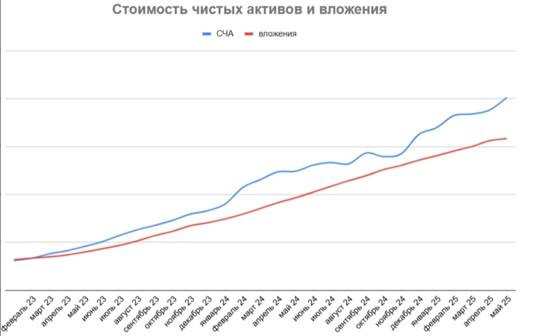 🔸Доходность XIRR (Extended Internal Rate of Return), которая учитывает вложения и доходность с начала 2023 года по май 2025, выросла в мае с 14 до 17,6%.