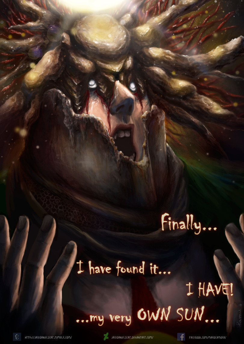В игре Dark Souls довольно... мрачная атмосфера. И Солер из Асторы (с пером в шлеме) - самый жизнерадостный, неунывающий и позитивный из всех персонажей, к тому же еще и великолепный помощник. Но только его квестовая линейка заключается в то, что в поисках "собственного солнца" он проходит опаснейшие места, но нигде не может найти его. В конце, отчаявшись, он надевает на голову ярко светящегося жука и сходит с ума, нападая на игрока. Впрочем, это только одна из концовок...