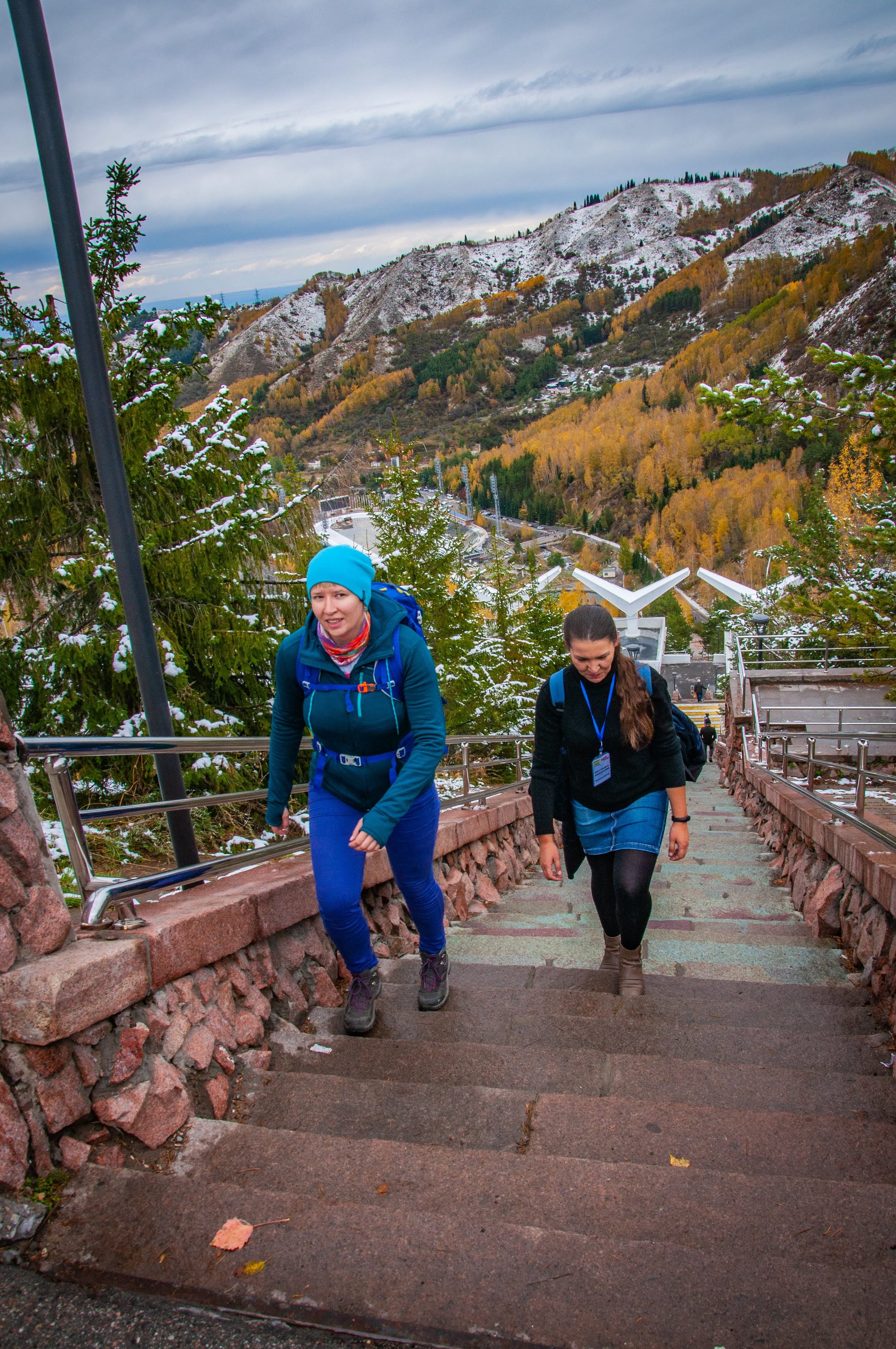 12 октября. Обломавшийся день даунхилла. Горы припорошило снегом, но мы устроили нашим приезжим гостям небольшую прогулку «в ближайшие пригорки» и посвящение в алматинцы – загнали на лестницу здоровья (восемьсот с гаком ступенек) и угостили яблочком-апортом. И то, и то известный символ Алматы, известней которых только горнолыжный курорт «Шымбулак» и ледовый каток «Медео». Хотя, нет, в Алматы нет ничего известней, чем легендарное яблоко.