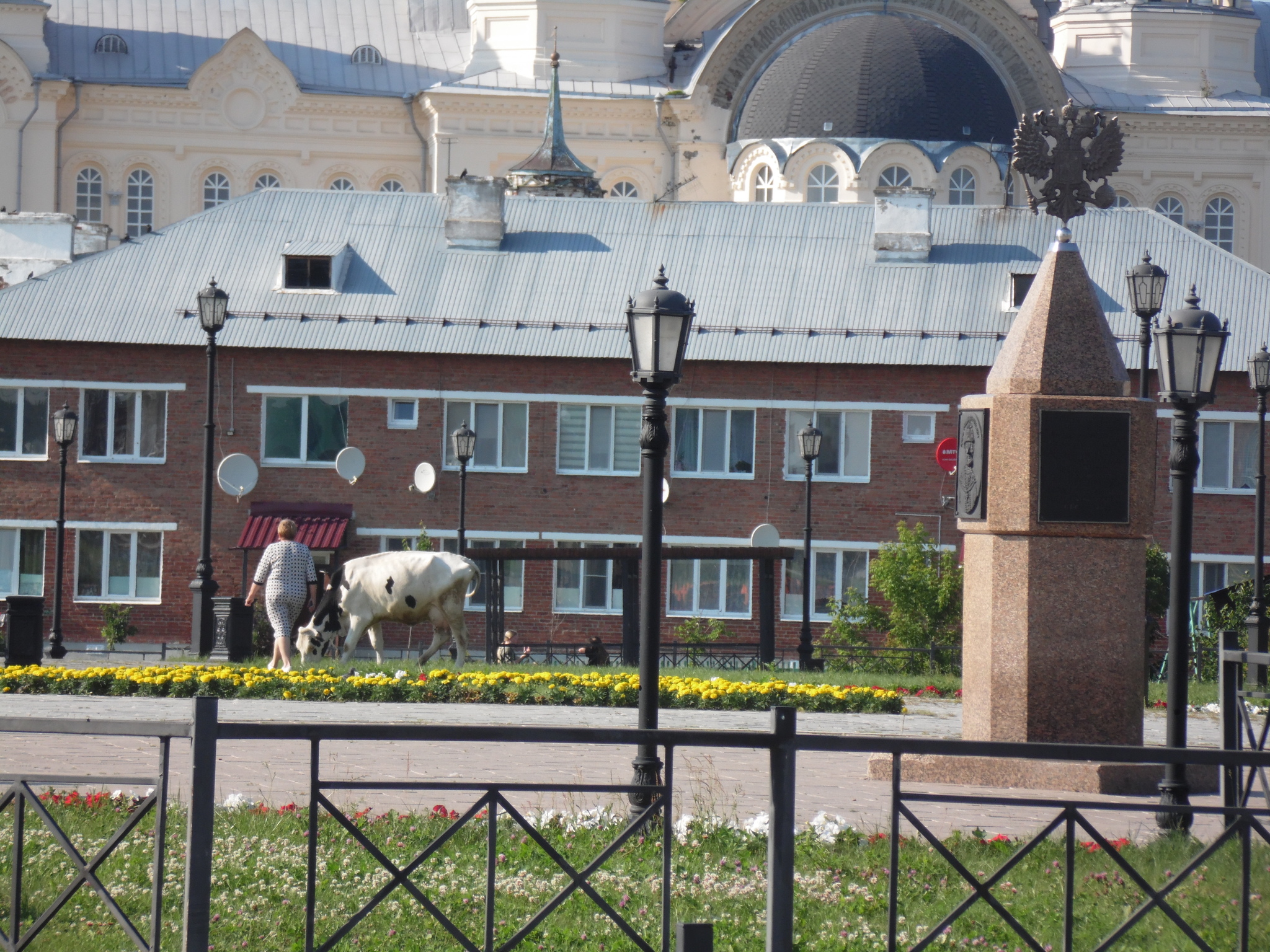 Верхотурье, духовная столица Урала. Город, которому не повезло дважды - сначала открыли более удобный путь через горы, а потом оказалось, что в окрестных горах нечего добывать. Сейчас в этом скорее поселке кремль и огромный монастырь (см. задний план, а еще несколько снесли при СССР) смотрятся куда страннее, чем вот эти коровы прямо на улице. Даже железная дорога прошла в шести километрах от центра и приходится ехать от вокзала на автобусе.