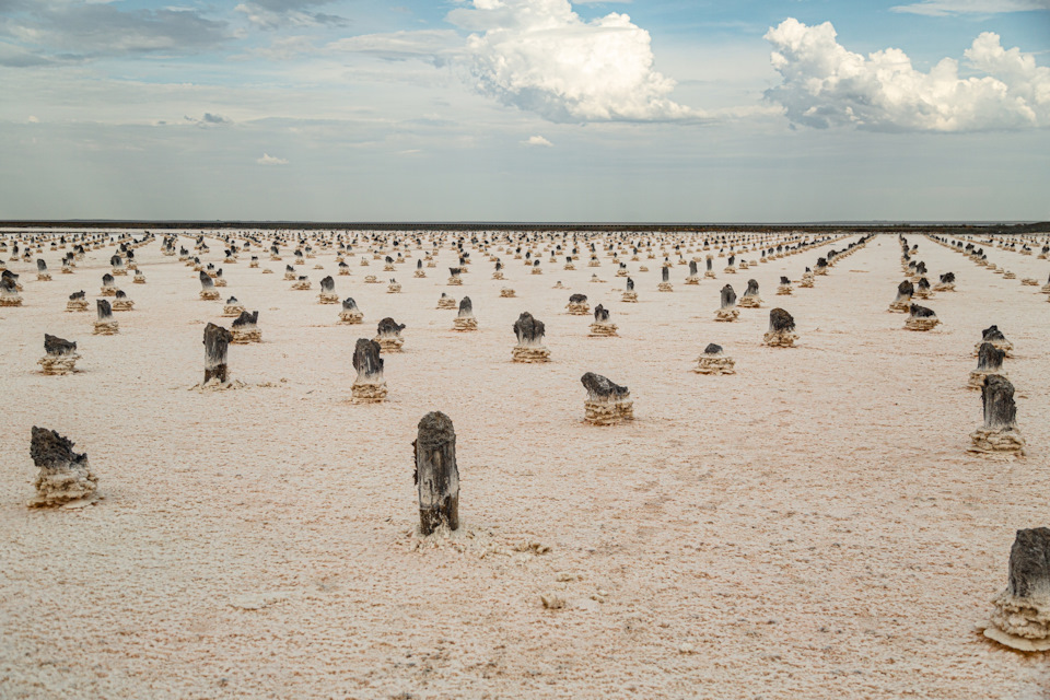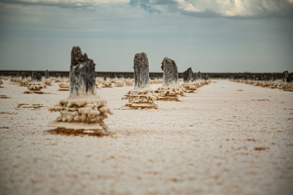 Итак, что такое Баскунчак… Это верхушка ОГРОМЕННОЙ соляной горы, которая живёт под землёй. И, в отличие от озера Эльтон, здесь всё ещё продолжается добыча соли. Да, те самые крутые кадры с поездом, который едет по озеру, это именно отсюда. Причем, положение рельс все время меняется. Соль добывают — рельсы перекладывают в другой "угол" озера. Потом в другой, третий, пятый и так далее. На берегу озера действующий завод по переработке соли — Руссоль.