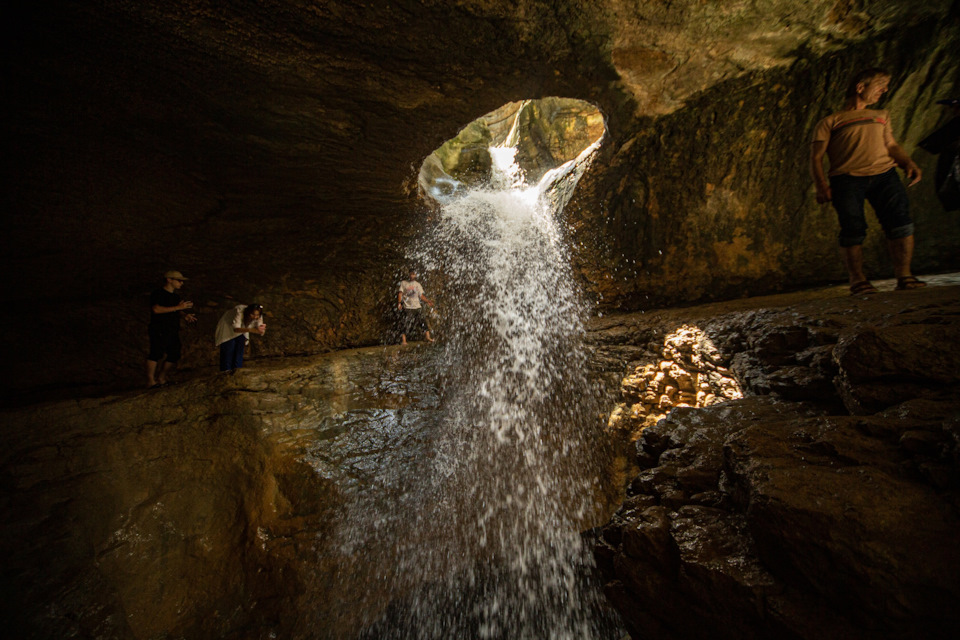 В общем, вы идёте метров… 150-200 по каньону, по которому бежит горный ручей. И потом приходите к ПОДЗЕМНОМУ ВОДОПАДУ! Пёс-перепёс, водопады сами по себе крутые, а тут ещё и подземный! Оно того очень даже стоит!