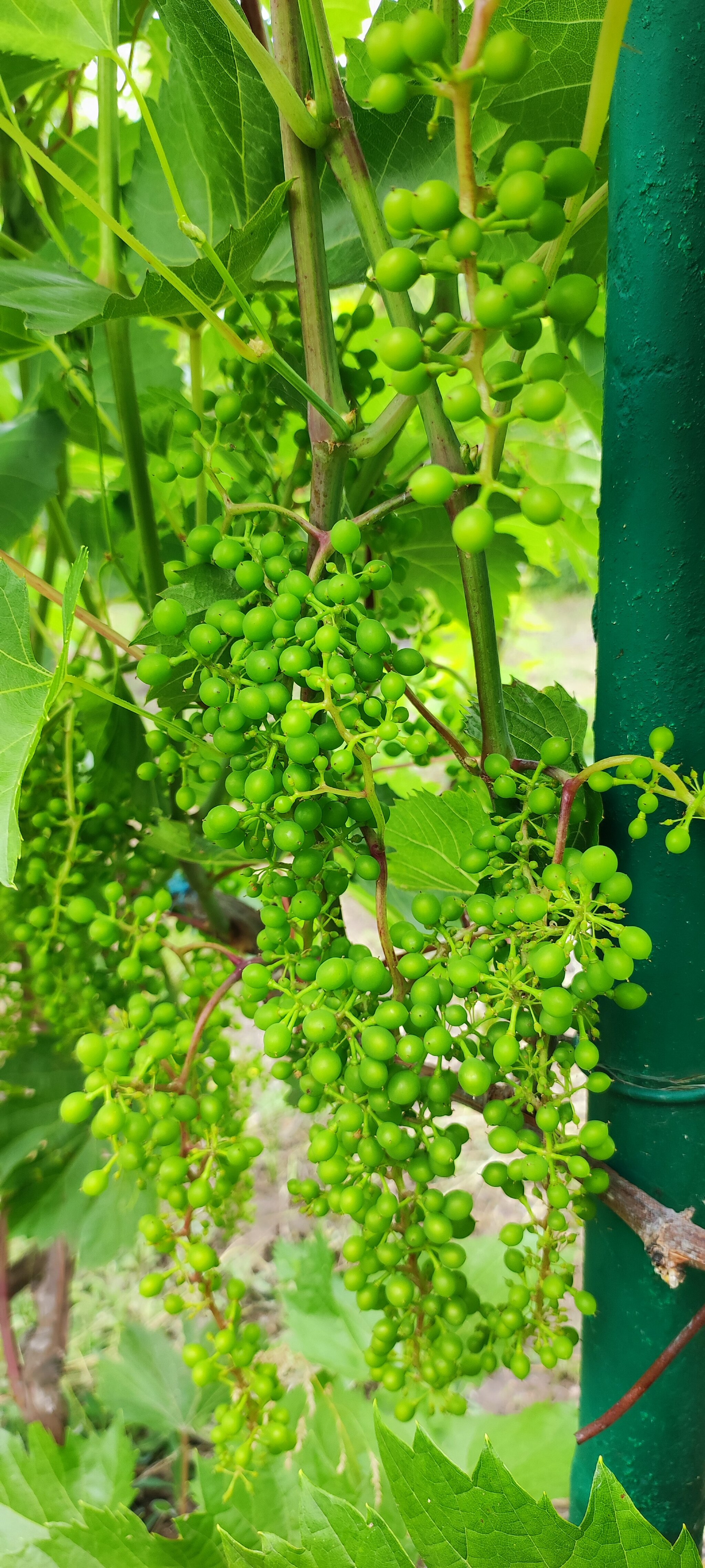 Выломка пасынков, подвязка, нормировка. Пасынки я выламываю, оставляя 1-2 листочка. Подвязывать стараюсь по мере роста, иначе ветром может поломать побеги, если лоза сама не успеет зацепиться. Нормировку гроздей провожу после цветения, так как не ясно что и как опылится из-за погоды.