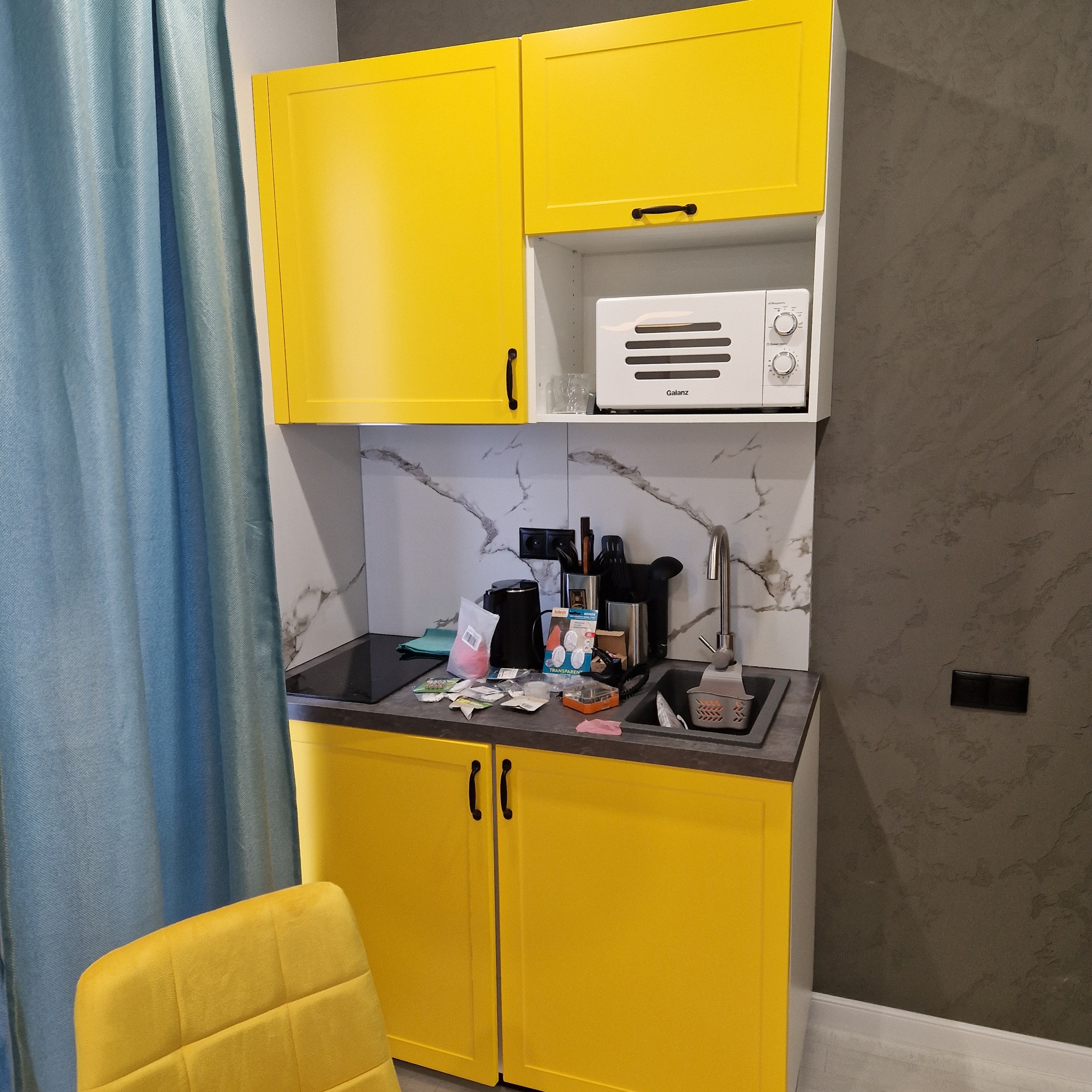 Слева желтая комната с желтой кухней