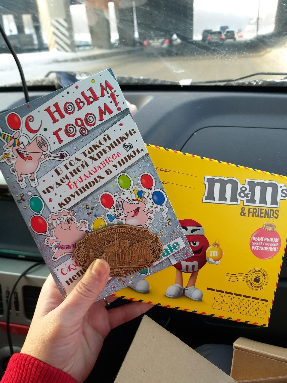 классная упаковка!! хрюшки/собачки - внутри коробка сладостей от M&Ms с магнитиком Новосибирска и прикольной открыткой - читаем пожелания & жуем шоколад!!! Настроение не испортил недовес в 400г. в посылке - пусть всем будет сладко и радостно в Новом Году!!