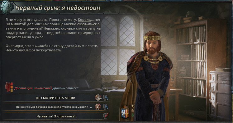Однажды его Маршал намекнул королю о том, что рыцари малочисленны и стоит присмотреться к придворным, нельзя так сильно запускать армию. Константин видя своё неумелое управление снова словил нервный срыв.