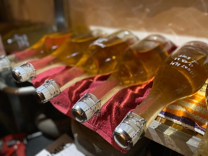 Оранж активно бродил около 2 недель, до сих пор стоит под плавающей крышкой на мезге. 2-3 раза в неделю перемешиваем, чтобы избежать задушки (появление неприятной ароматики) Перед НГ сниму с мезги и оставлю на осадке на созревание и осветление.