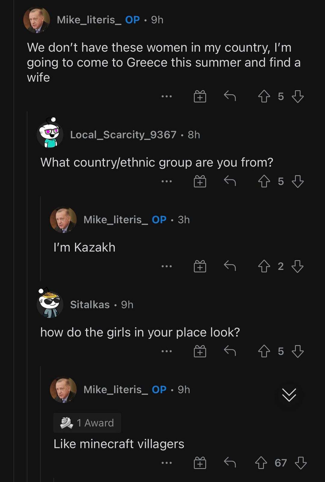 13 DirtySocks Из Нурсултана с любовью 3 года назад - у нас таких женщин нет. Приеду в Грецию этим летом и найду себе жену- из какой ты страны / этнической группы?- я Казах- и как выглядят девушки в ваших краях?- как селяне в Майнкрафте Reddit Комментарии Казахстан Девушки Юмор Minecraft 2 Ещё 0