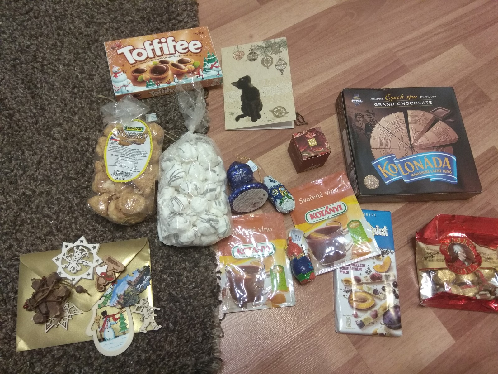 Углубляемся в коробку и находим ништяки-шоколад, глинтвейн, конфетки и игрушки на ёлку!