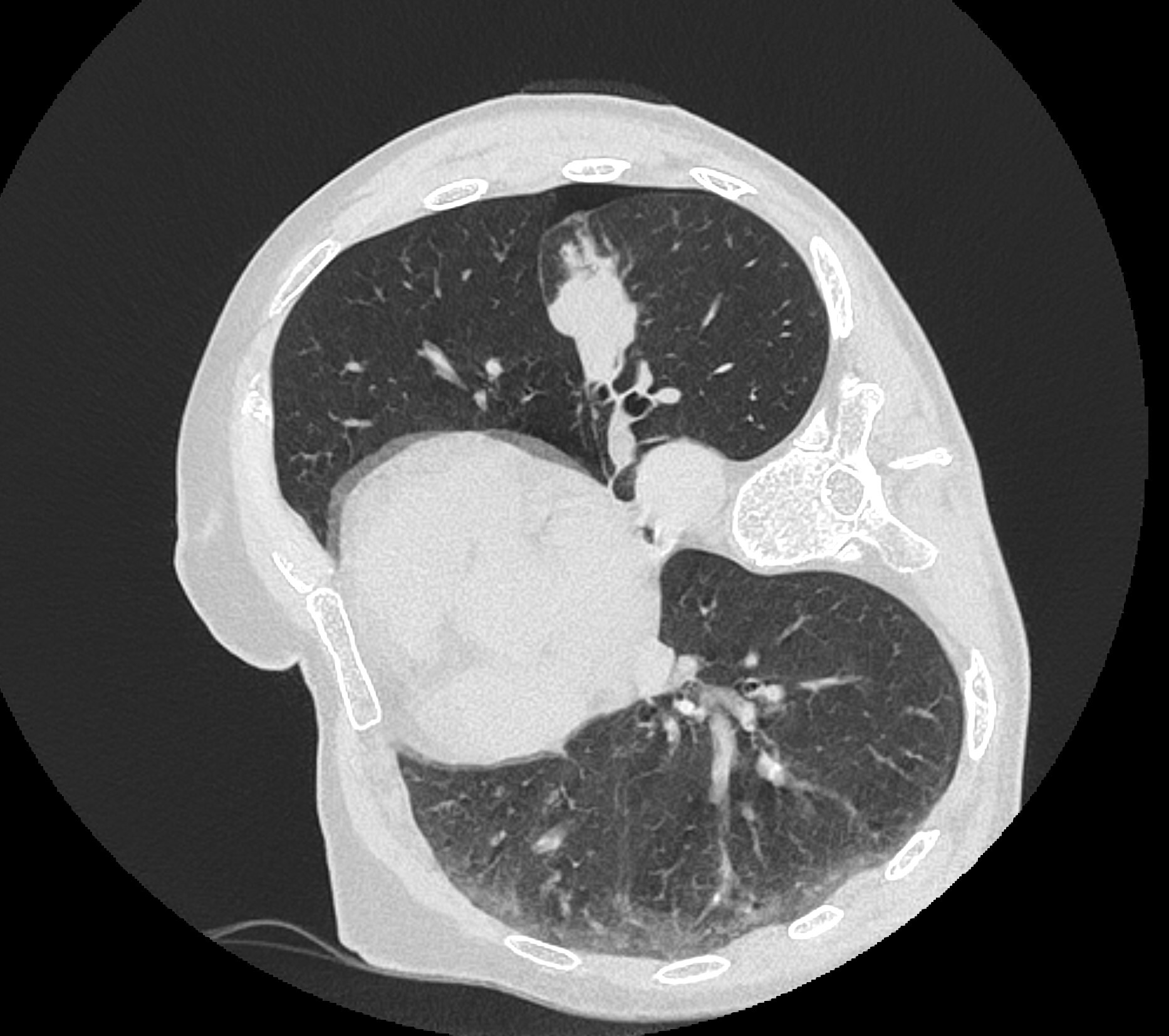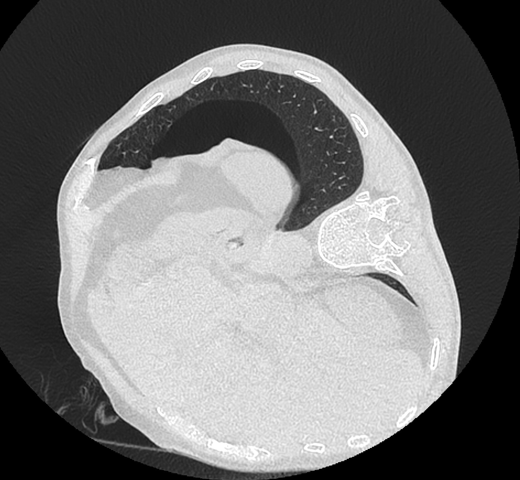 Но вот контрольный скан после интервенции показал небольшой пневмоторакс (черная область в лёгком):
