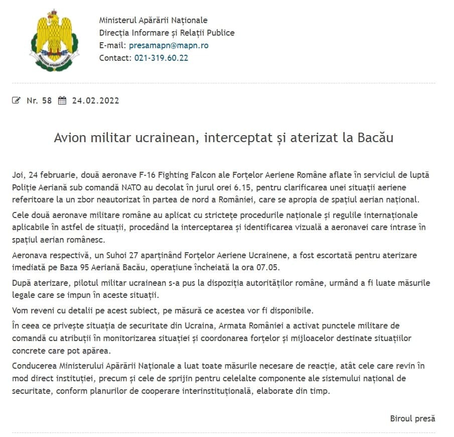❗️Министерство национальной обороны Румынии сообщает (https://www.mapn.ro/cpresa/17283_avion-militar-ucrainean,-in...), что сегодня утром Су-27 ВВС Украины совершил несанкционированный перелет румынской границы и был посажен двумя F-16 ВСС Румынии на авиабазе Бакэу.