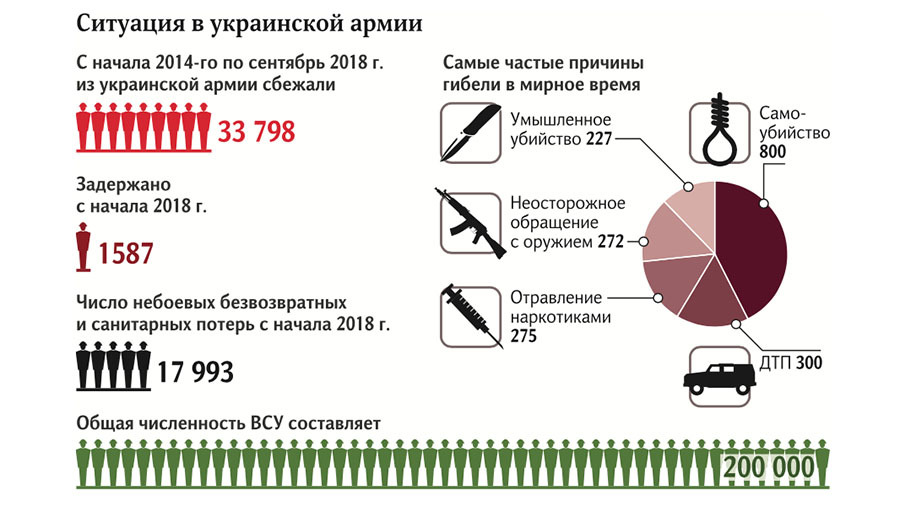 Данные о беглецах содержатся в докладе главного военного прокурора Украины Анатолия Матиоса о состоянии правопорядка и воинской дисциплины в ВСУ. Каково точное соотношение дезертиров и самовольно ушедших — не указывается. При этом беглецов почти не ловят, отмечает источник издания, за весь период были задержаны только 1587 человек.