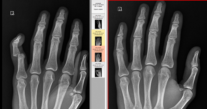 Еще одна кисть. Вывих средней фаланги 5-го пальца. На контрольной рентгенограмме справа вывих отсутствует.