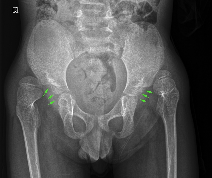 На Rn-граммах тазобедренных в прямой проекции в вертикальном положении, в условиях динамической нерезкости, в атипичной укладке: с небольшим разворотом вправо, определяется двусторонние вывихи тазобедренных суставов на фоне дисплазии крыш вертлужных впадин (вертлужные впадины указаны стрелками). Суставы определяются гораздо выше впадин. Снимки и описание делала моя коллега.