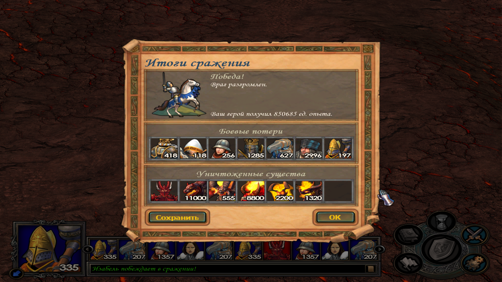 Был у меня выходной. Дело было не вечером, но делать было нечего. В общем, решил я ещё разок пройти кампанию Героев 5. Скажу честно, играл на рекруте, ибо кампания и неохота париться. Суть. 5 миссия кампании за орден порядка. Должны смахнуться Аграил и Николас, последний, ясное дело, помрёт. Я решил попробовать взять гарнизон, но там уж очень много существ и я бы запарился клацать "пропустить ход", поэтому решил просто завалить Аграила. Первый раз бросил ему вызов с вчетверо меньшим войском, хотел оценить, с чем буду иметь дело. Посмотрел, накопил армейку и пошёл махаться ещё разок. Да только, незадача, у Аграила армия выросла ещё больше, и даже не пропорционально больше. Поэтому вариант копить армаду 100тысяч+ смысла не было.