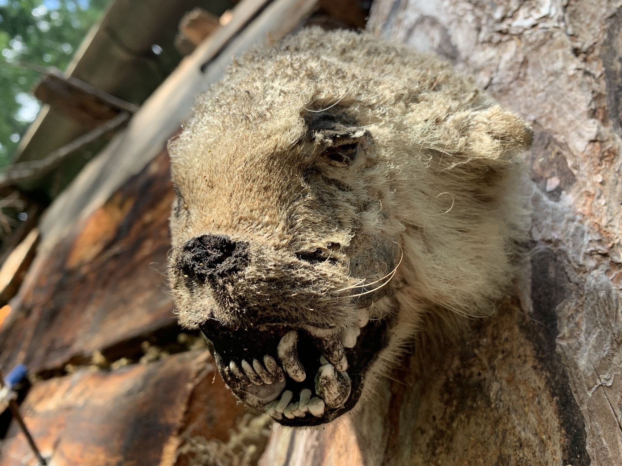 Это зимовье оказалось менее уютным, чем предыдущий домик, что вполне объяснимо — тот строили для отдыха, а это, скорее всего, для промысла. Внутри возле избы висела кроличья лапка, а снаружи на стене кто-то прибил голову какого-то зверя. Кажется, это была росомаха, но кто знает наверняка?