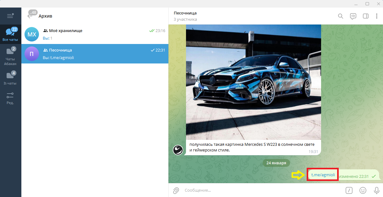 В моем случае это будет такая ссылка(которую я напечатал в чате который сам создал).