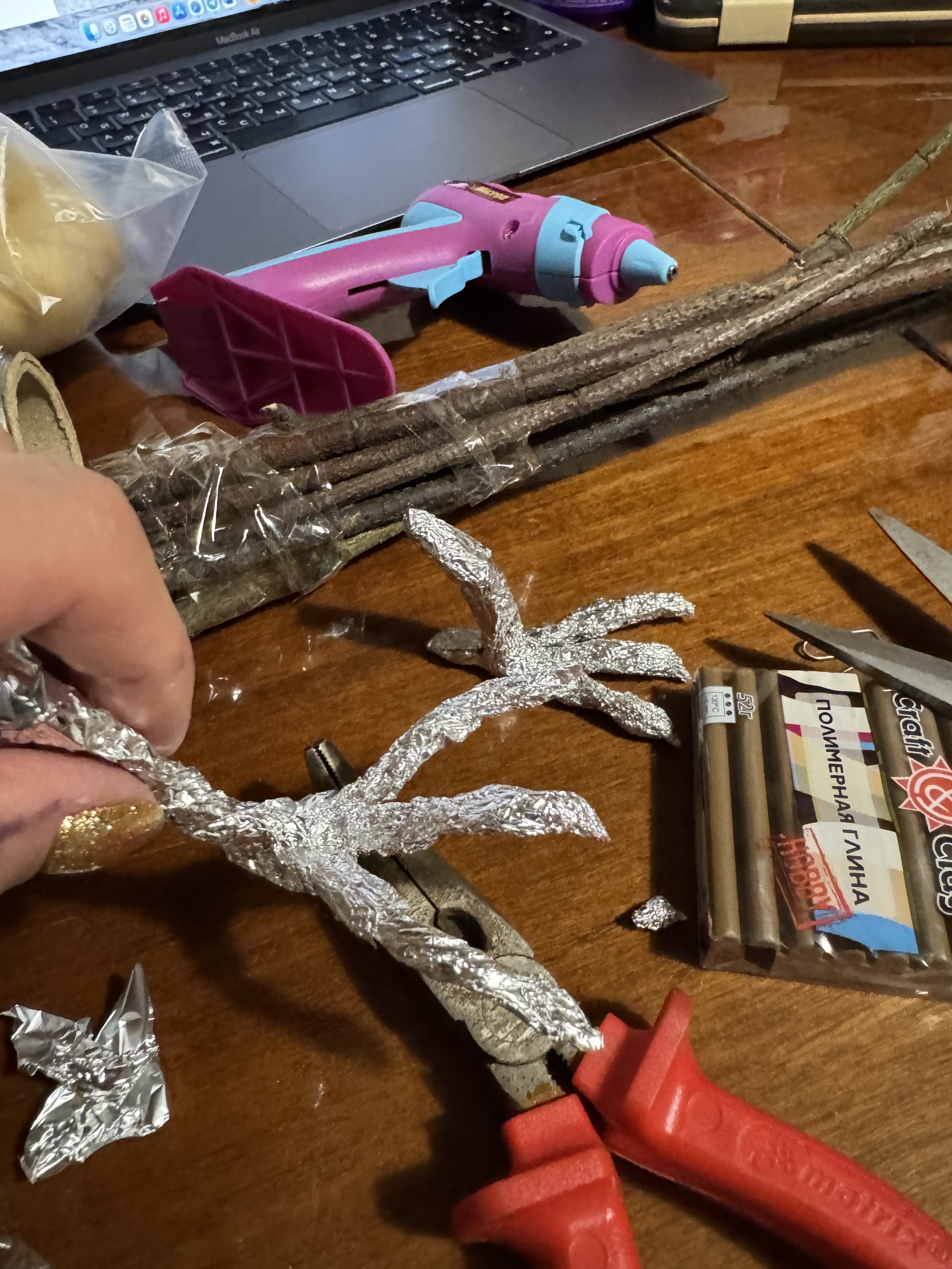 Мы обсудили список того, что будет необходимо приобрети в магазине для припизднутых творческих людей: 1 пистолет клеевой, полимерная глина, мох (обязательно), деревянные палочки как от мороженого, шерсть (там были обсуждения, из чего делать важный элемент). Благо, в нашем доме есть проволока, краски, кисти, фольга, маркеры и прочие мелкие расходники.