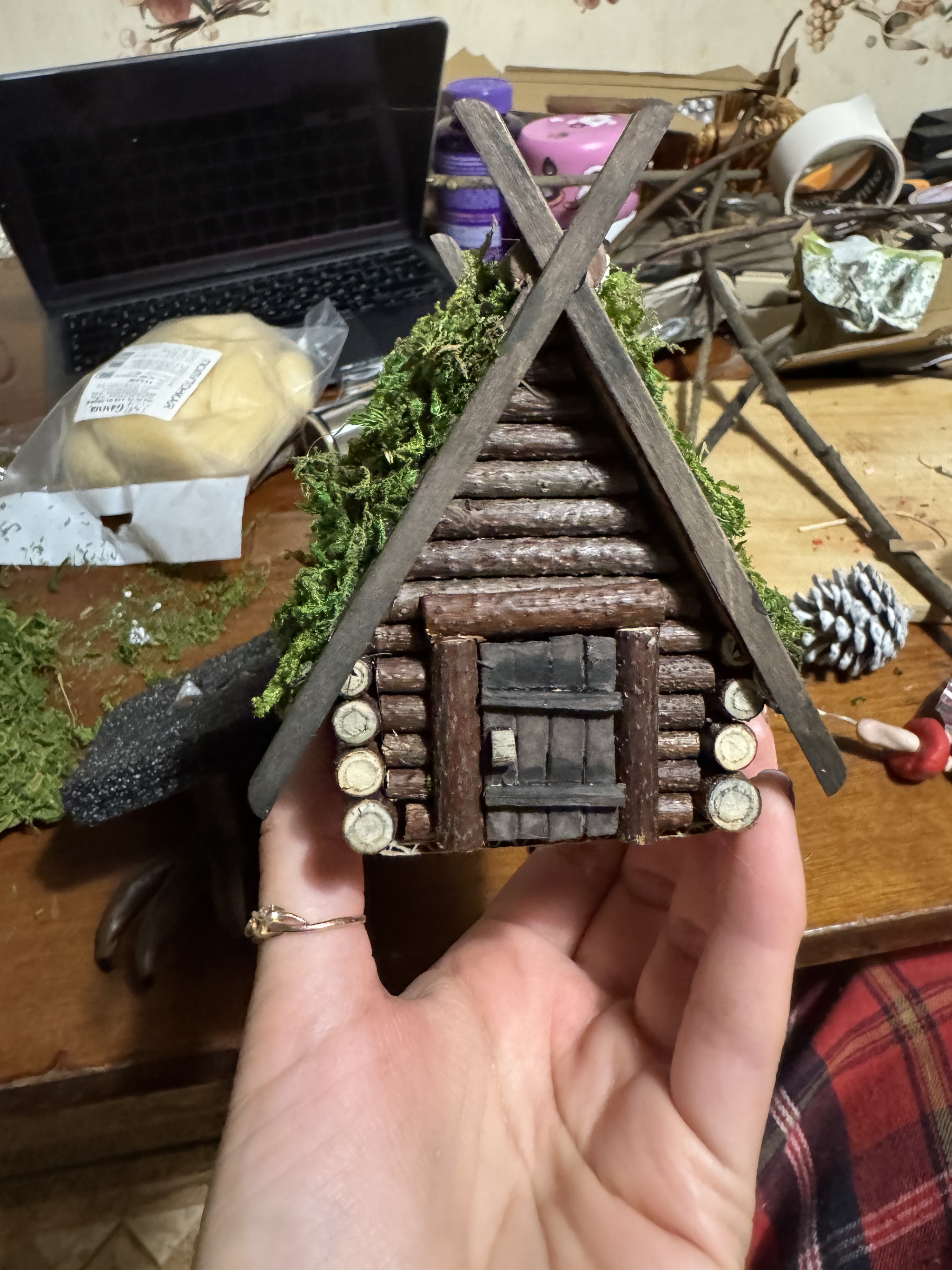 Основа дома - картон. внутри - вспененный полиэтилен, чтобы сам домик держал форму и его не вело при наклеивании бревен. Крыша - картон, на который наклеены палочки от мороженого (они продаются в качестве палок для размешивания воска при изготовлении свечей или эпоксидной смолы). Их раскрасили гуашью. Сверху на ПВА бахнули мох, предварительно добавив на него трубу.