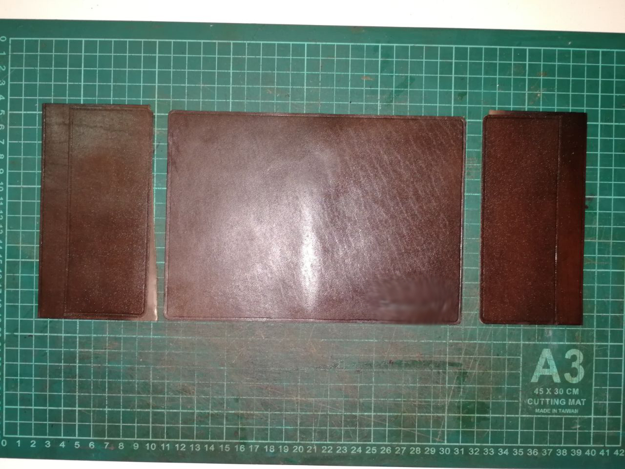 После того как вырезал точные размеры, выполнил "биговку" наношу финишное покрытие, цвет становится более насыщенным а дефекты кожи и покраски менее заметными.