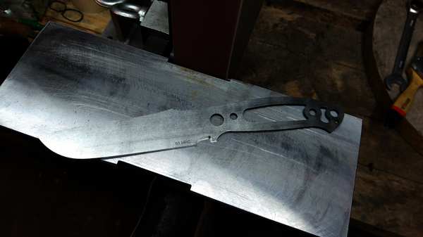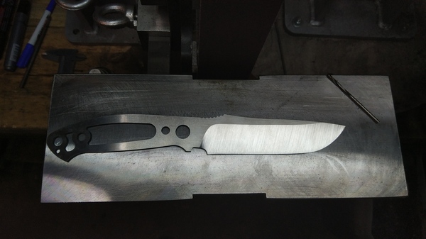 CPM-3V это весьма ударостойкая сталь с большими механическими возможностями. При слесарки клинка было принято решение сводить в 0,40-0,5мм, сказано-сделано 0,45мм, заточка по 20* на сторону.