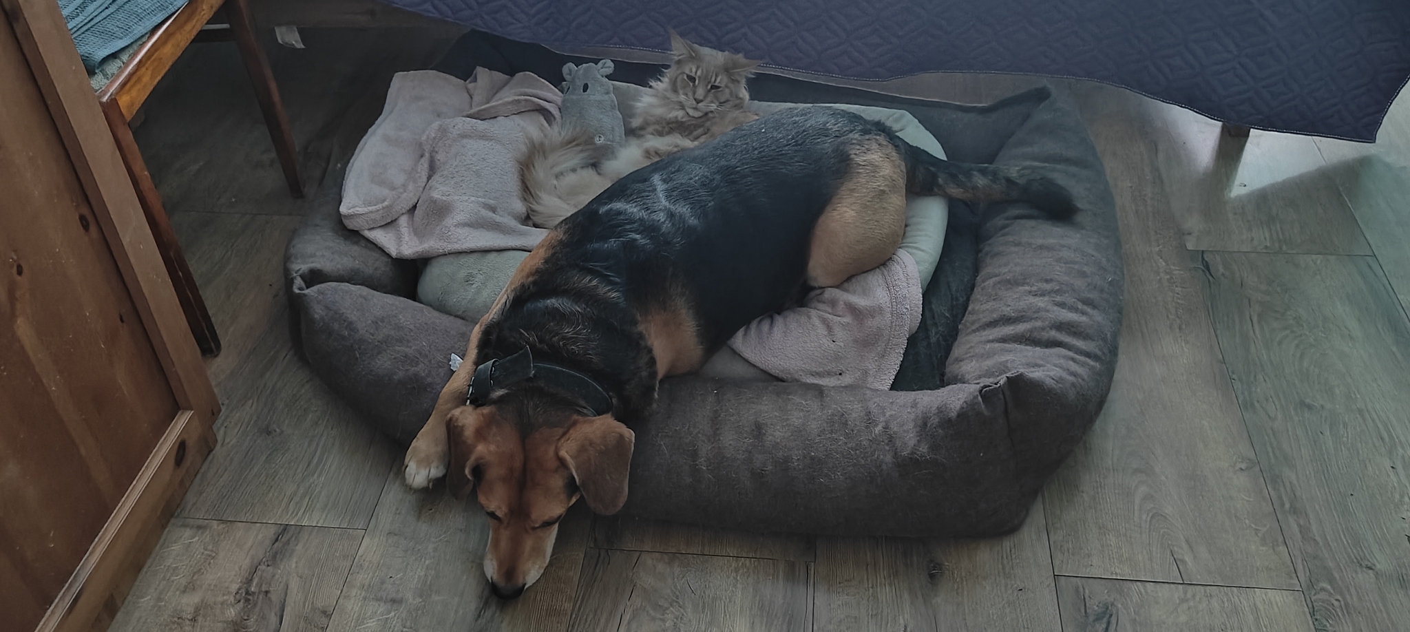 Барон обхватил голову небольшой собачки своими лапами и задремал.