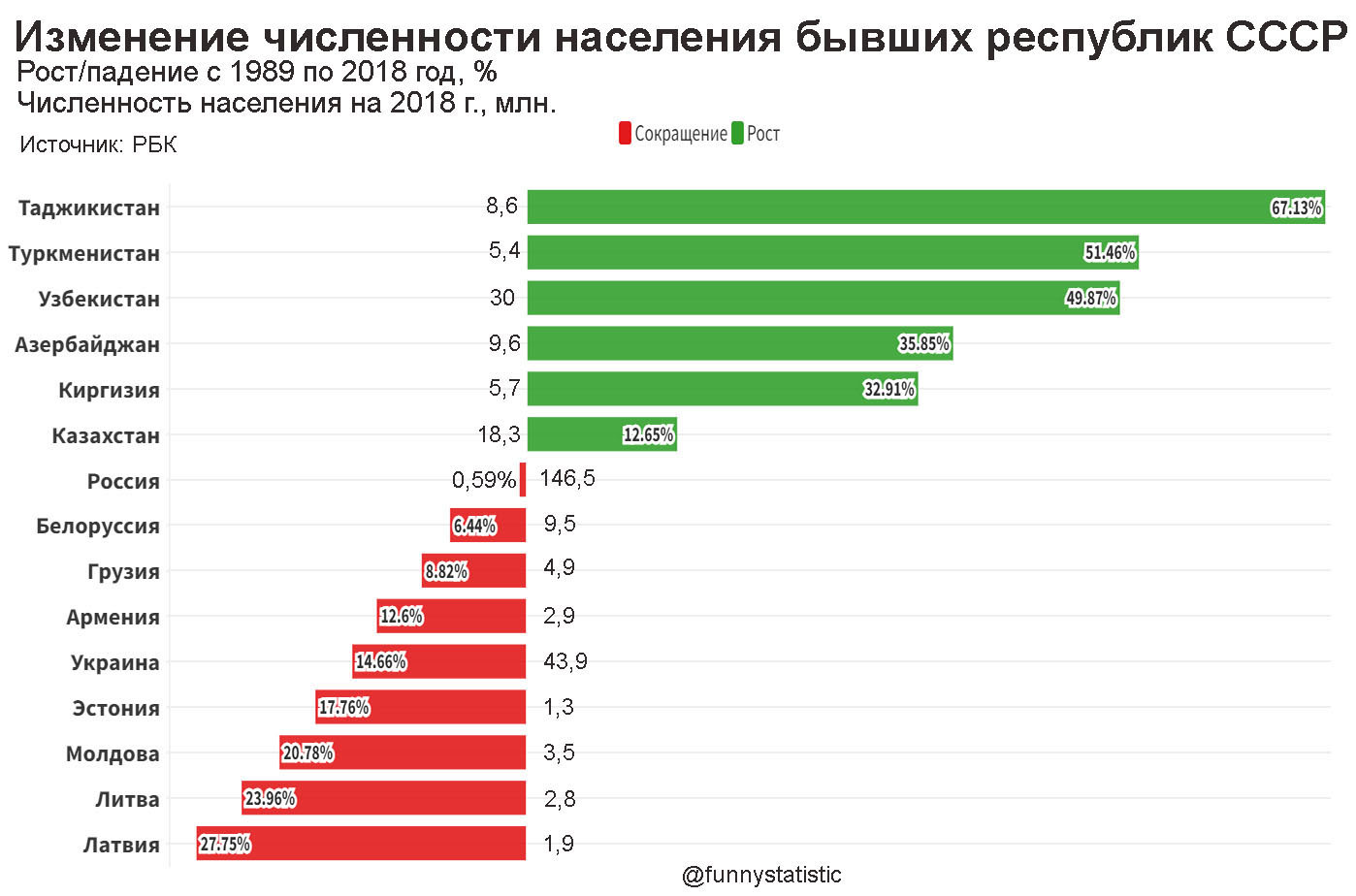 2514 FunnyStatistic Политика Изменение численности населения бывших советских республик (с 1989 по 2018 год) 3 года назад [моё] Статистика Сравнение Россия СНГ Украина Демография Численность населения Политика 56 44 13 9 8 Ещё 0