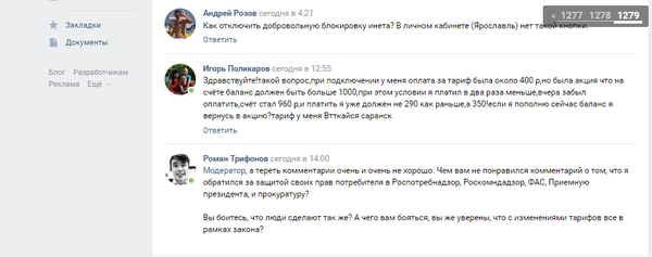 Собственно, в самой ветке вопросов ( https://vk.com/topic-43226633_27580381 ), в которой мы достаточно долго переписывались с модератором, и в которой я сообщил, что согласно пункту 7 Договора оператор не может менять цену, и что я обратился в государственные органы, стерты практически все мои реплики кроме неработающего интернета. Вообще все.