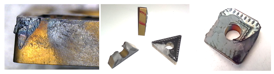 После того, как частички материала как бы припаиваются к поверхности пластины, они в процессе обработки откалываются, но уже вместе с покрытием и частичками самой пластины, что естественно приводит к преждевременному износу. Плюс ко всему работая с таким наростом, который то появляется то исчезает, страдают размеры детали - они меняются в зависимости от того, есть нарост или он уже откололся. Такая проблема характерна особенно для вязких материалов (аустенитные нержавейки, например). Чтобы предотвратить наростообразование нужно повысить скорость резания! Поэтому когда люди обрабатывают ту же нержавейку со скоростью скажем 40 м/мин. с целью продлить жизнь пластины, они получают обратный эффект. Также в данной проблеме немного может помочь СОЖ с высоким давлением и более острая геометрия самой пластины.