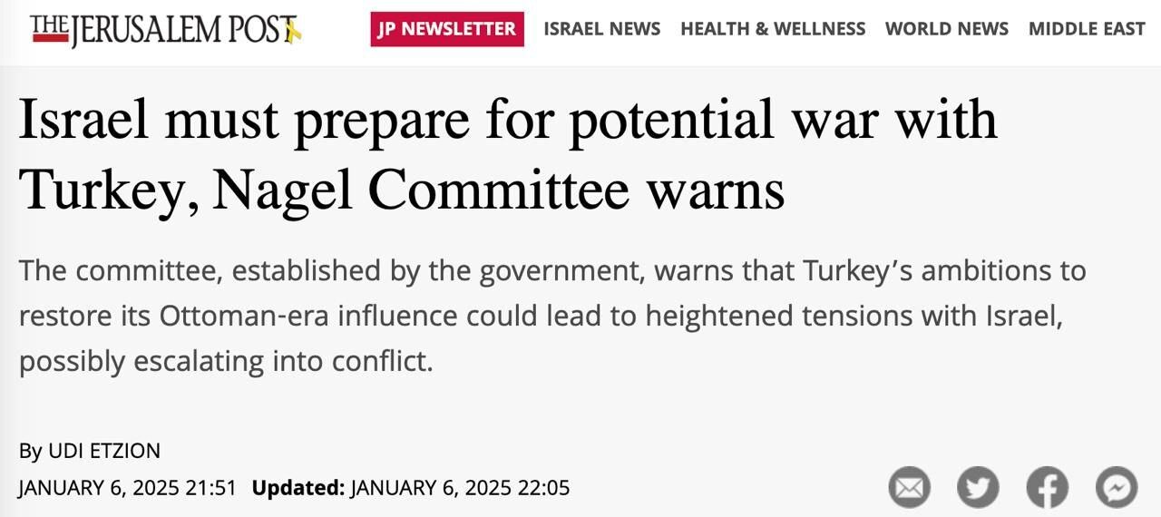 Правительственный израильский комитет Нагеля по изучению потребностей ЦАХАЛа и возможных угроз бьет тревогу, пишет The Jerusalem Post. Там считают, что Анкара восстанавливает свое влияние времен Османской империи, при которой Сирия и территория Израиля входила в нее.